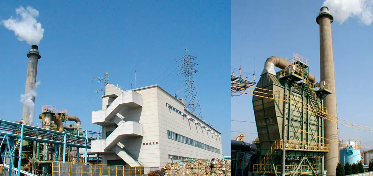 1987年に導入した自家発電設備は、ボイラーで造られた高圧蒸気と、抄紙機に使用する蒸気との圧力差をエネルギーとして利用し、工場で使用する全電力の9割近くを発電しています。 設置当初より、排煙脱硫装置・ガス再循環ファン・低NOxバーナー等、環境に配慮した設備を導入しており、排煙の排出基準を大きく下回っています。