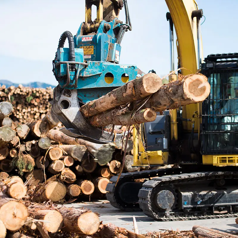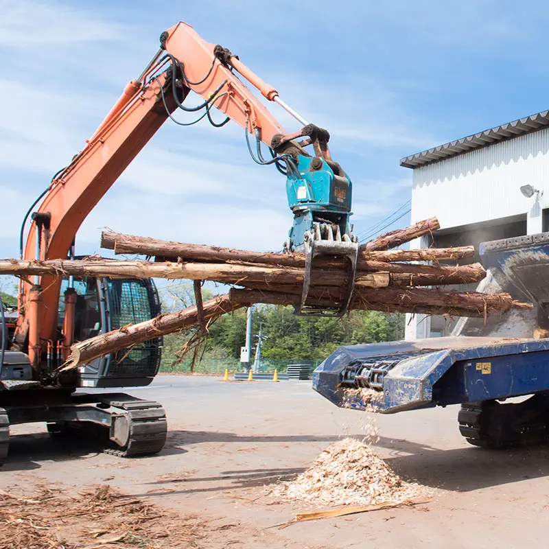 グループ全体としては、木質チップの製造販売だけでなく、山林伐採事業や原木の仕入販売、緑化事業、索道やモノレールの架設作業、堆肥や燃料用樹皮の販売、きのこ栽培用オガ粉の製造、一般貨物自動車輸送事業、産業廃棄物の処理・収集運搬など、幅広い事業を展開してきました。山陰丸和林業株式会社では、平成27年に八頭事業所の操業を開始しました。それまでは鳥取県東部地区では、木質チップの原料となるC材の需要がありませんでしたが、当社の八頭事業所に設備を整えたことで、鳥取県東部地区でのC材の搬出も徐々に増えてきました。